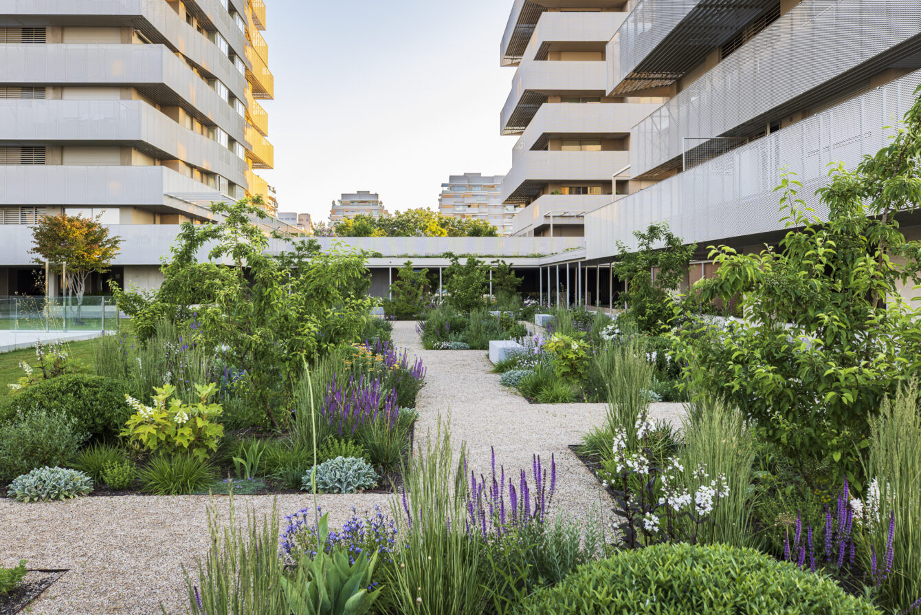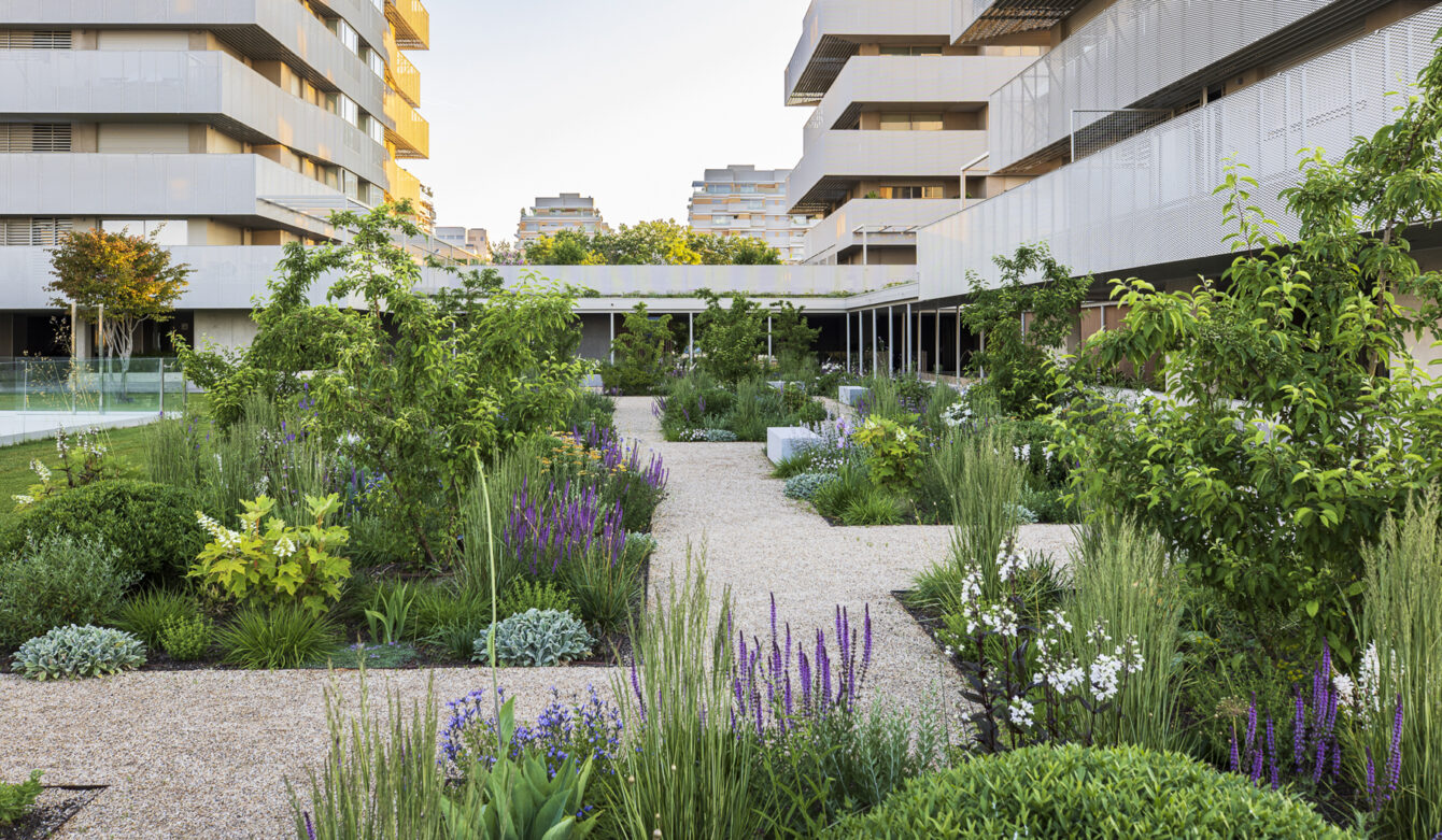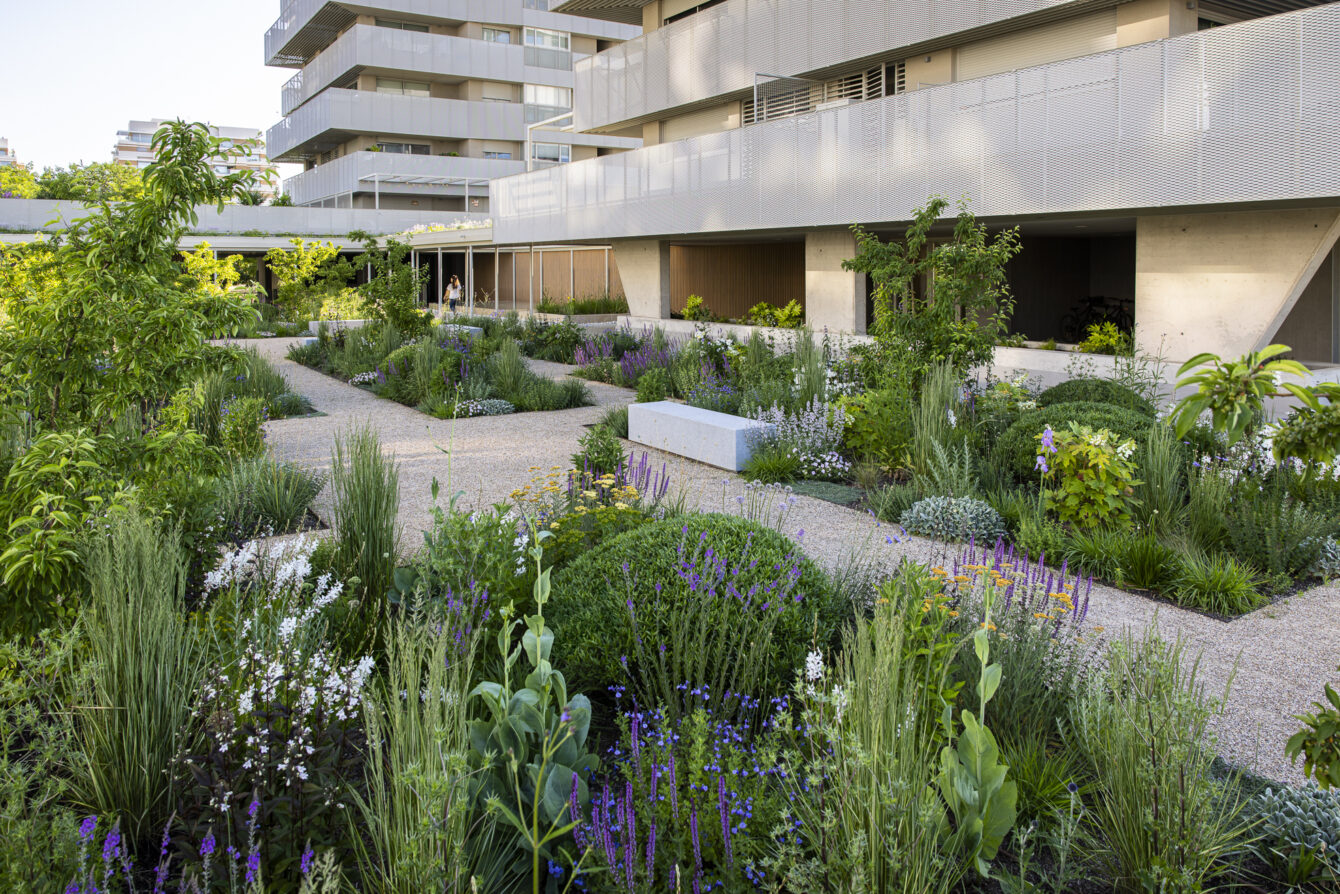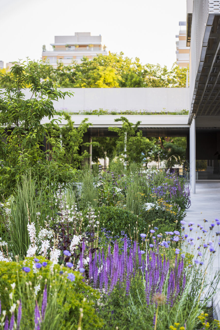 The planting scheme ensures year-round interest: staggered flowering, seasonal variations in texture, and consistent touches of color. As a structural element, ornamental crabapple trees are repeated throughout the garden. They flower white in spring and, in autumn, bear small red fruits that remain on the branches through winter.