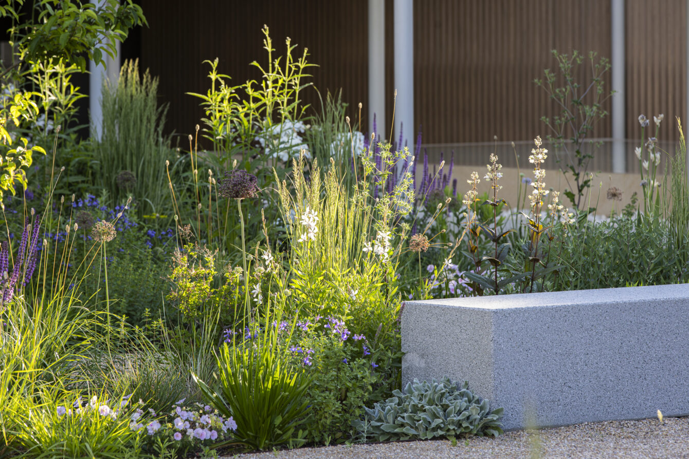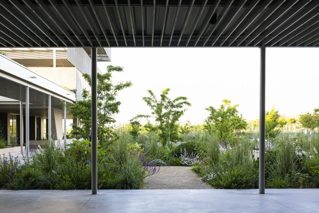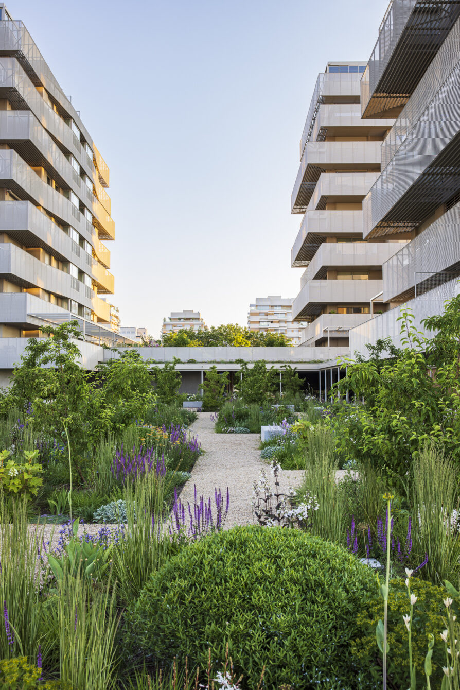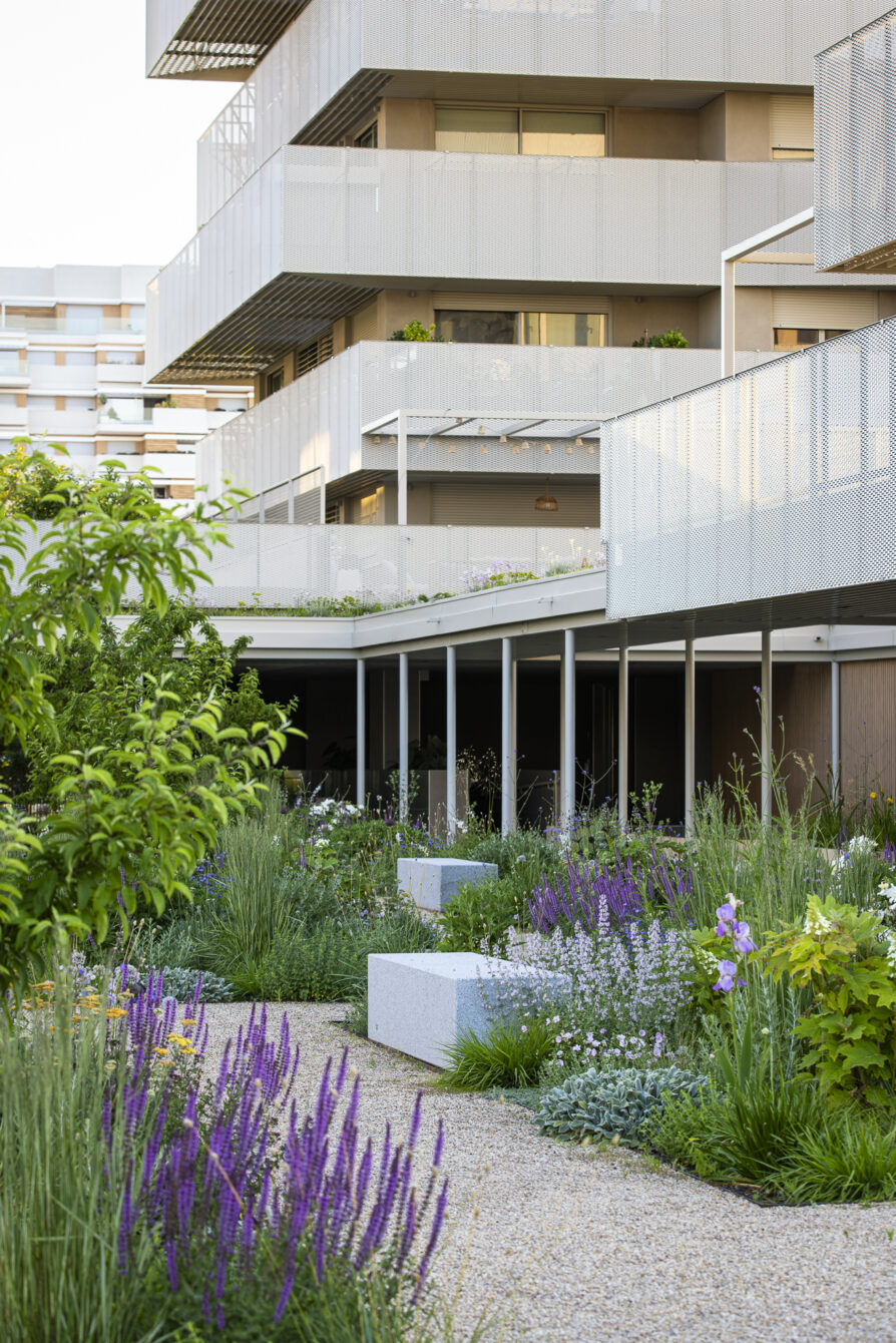 The planting scheme ensures year-round interest: staggered flowering, seasonal variations in texture, and consistent touches of color. As a structural element, ornamental crabapple trees are repeated throughout the garden. They flower white in spring and, in autumn, bear small red fruits that remain on the branches through winter.
