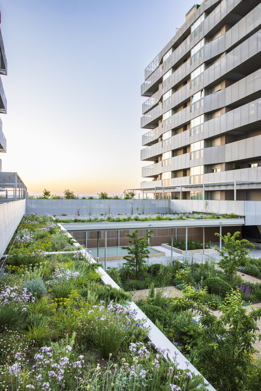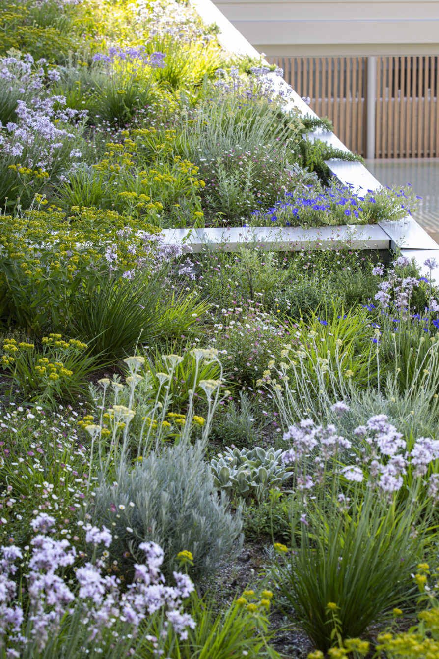 This garden is located on the roof of a parking structure, with a soil depth of only 20 cm. The planting is based mainly on perennials with a fresh appearance, visually connecting with the lawn around the swimming pool.