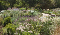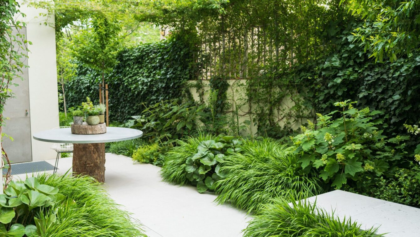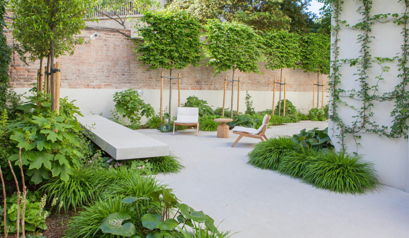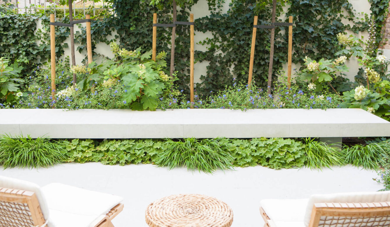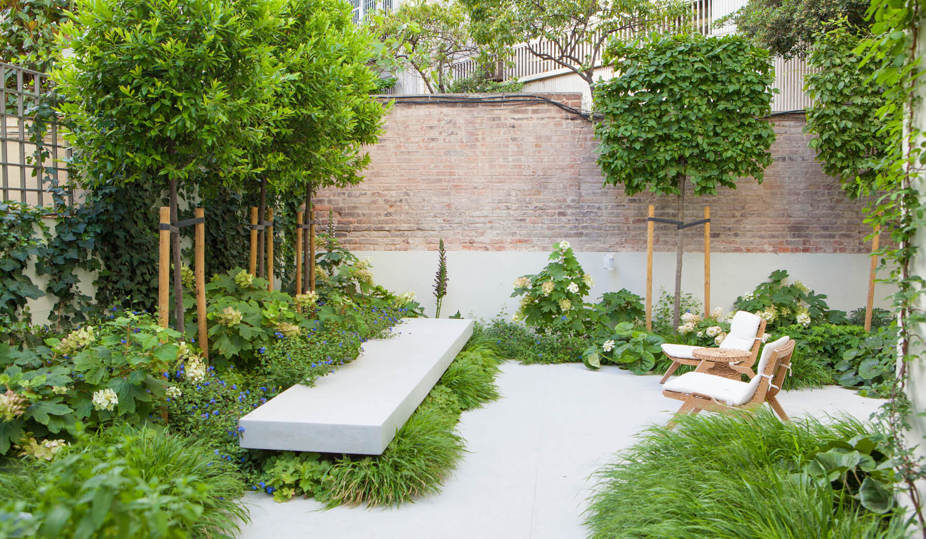 The garden was designed with flooring that continues seamlessly from the living room. The client wanted a sense of freshness and greenery, despite the absence of grass, which was not recommended. The space is framed by large planters combining plants with varied textures and blooms. A bench is integrated into the garden, giving the impression of floating among the vegetation. Project in collaboration with architects Beta Punto Cero.