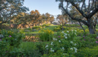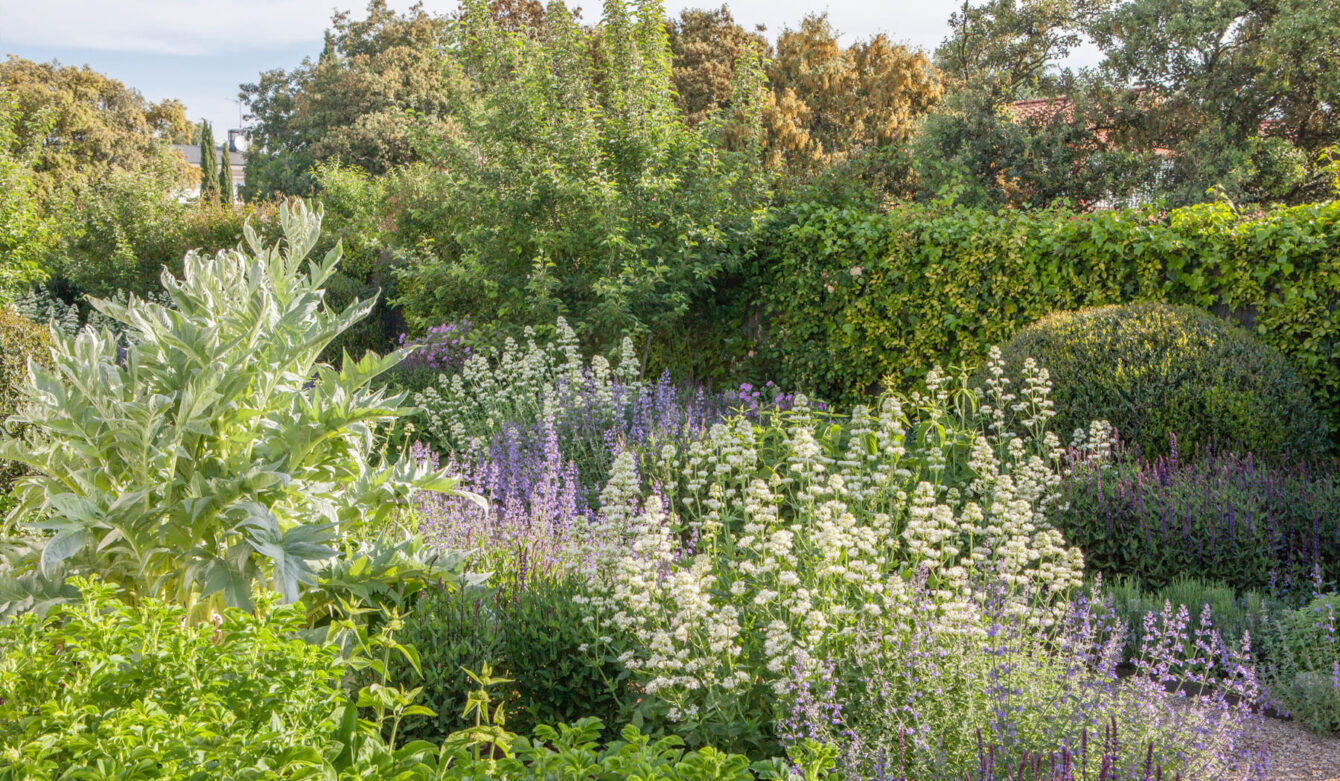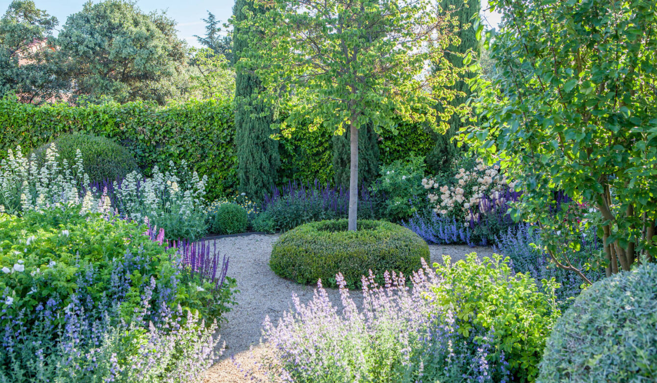 The style of this garden is the fruit of a happy synchrony: the desires of its English owner and the knowledge that Fernando acquired in Yorkshire, come to life in a leafy mixed border, created, of course, using perennials that are adapted to Madrid. The relaxing colors of the flowers are overlapped between the rounded hedges and large grey leaves of the artichokes that occupy a strip of land next to the house. A path runs through this splendid display of vegetation, leading to a circular space with a Judas tree (Cercis siliquastrum) in the center. In the back garden, next to a group of different species of hedges trimmed into the shape of a cloud, there is a wood and iron arbor, which is adorned with a spectacular climbing rose. On the other side, a raised, curved pergola provides a shaded area from which to enjoy the beauty of the garden.