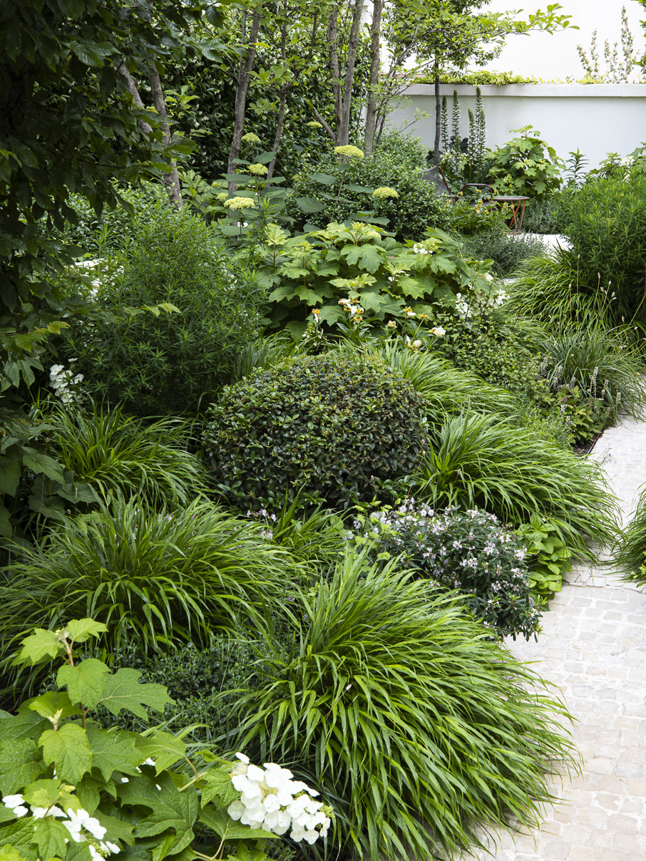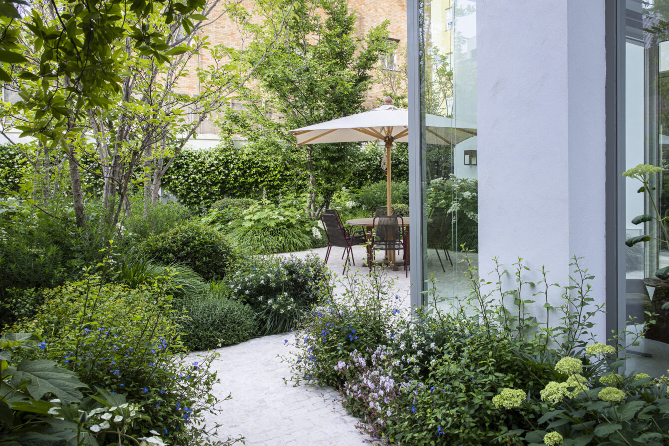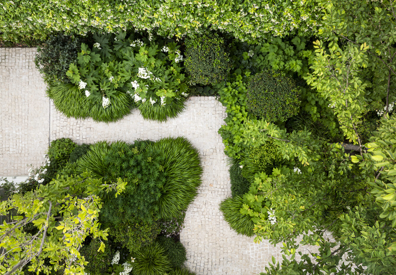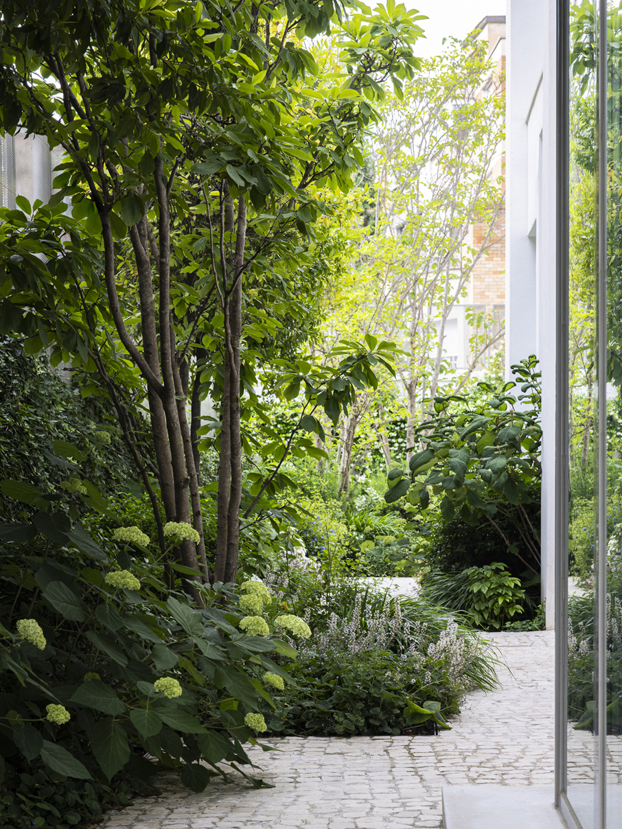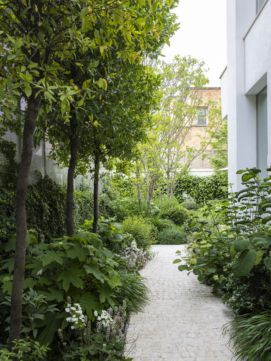 The Portuguese cobblestone paving enhances the greenery and provides a restrained, timeless backdrop for the planting.