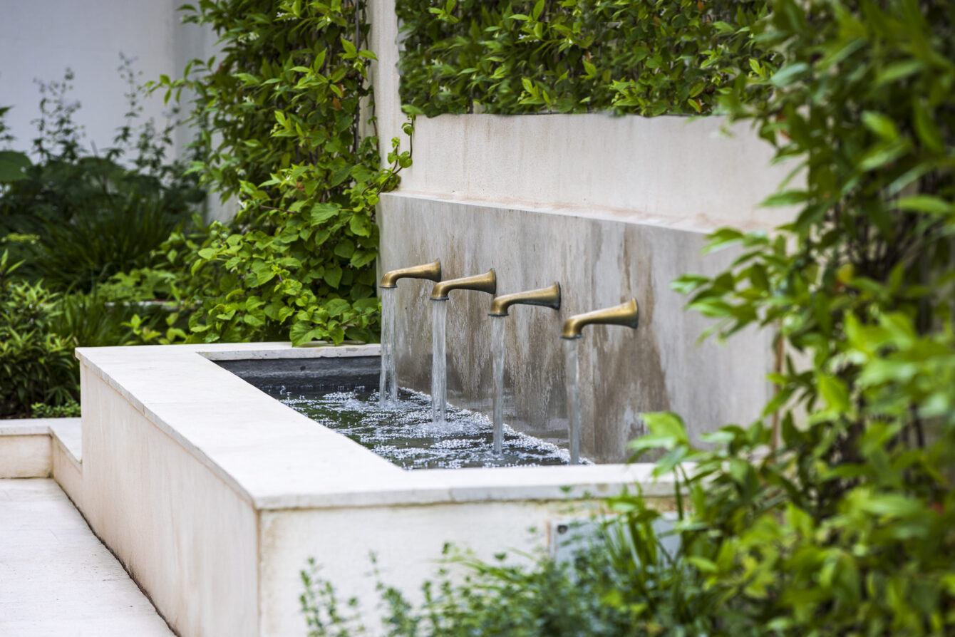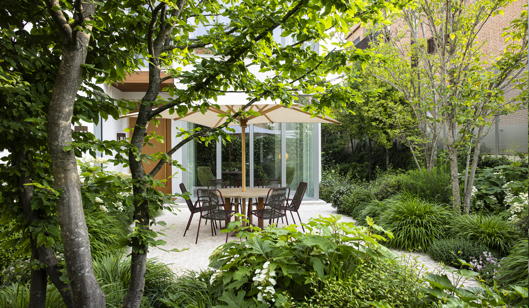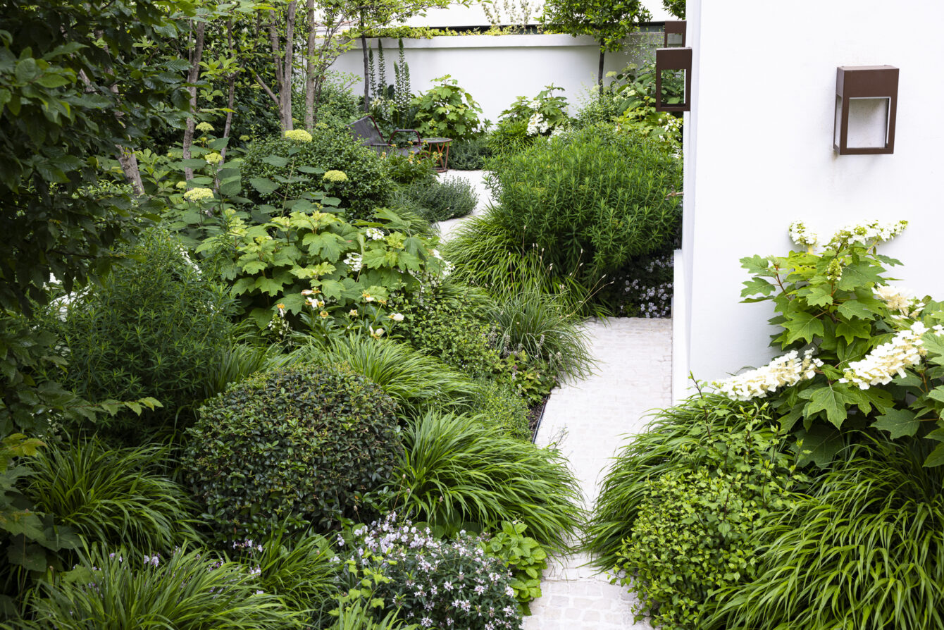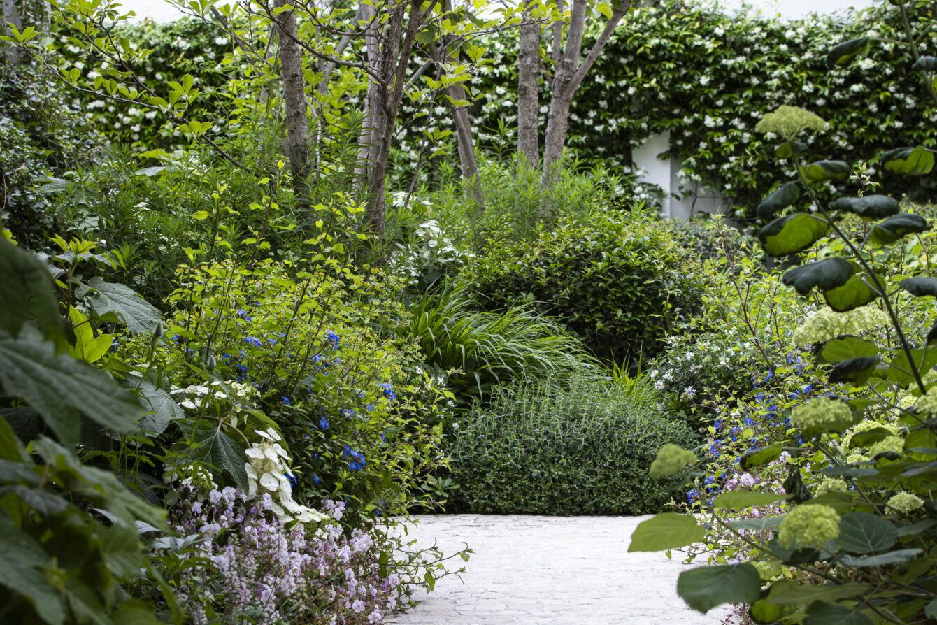 The Portuguese cobblestone paving enhances the greenery and provides a restrained, timeless backdrop for the planting.