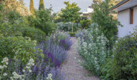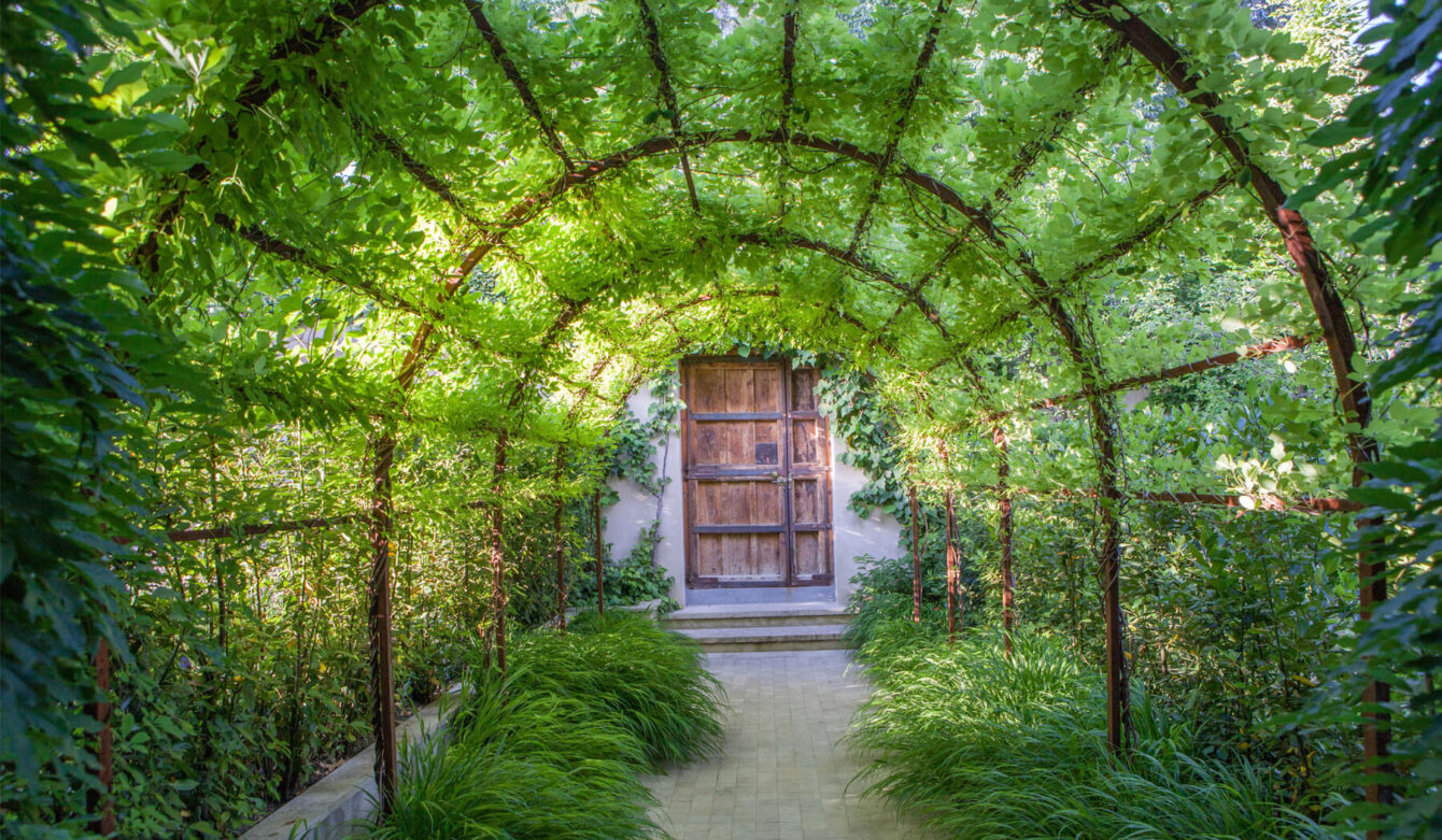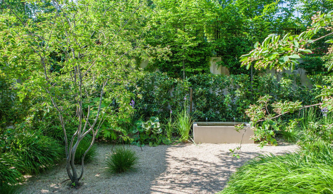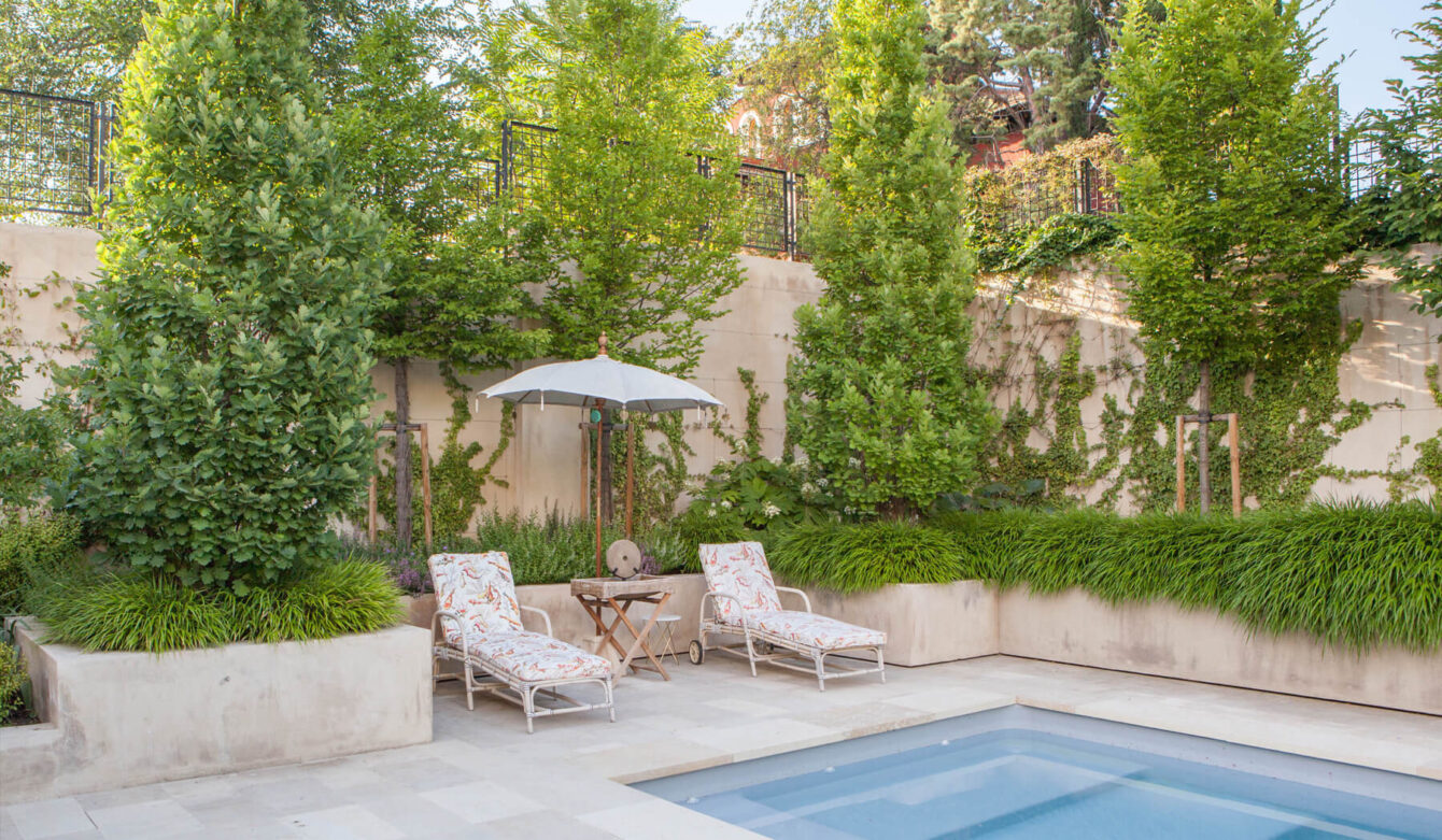The garden is organized around an entrance pergola that welcomes visitors to the house and divides the space into two distinct areas, providing privacy for each. The surfaces are defined by zones: areas of natural stone and others of compacted gravel, creating clear and structured paths. Large plantings of trees and vegetation surround the spaces, integrating the garden with its surroundings and providing shade and freshness. The combination of structure and planting achieves a balance between order and naturalness, resulting in a functional and inviting garden in the heart of Madrid