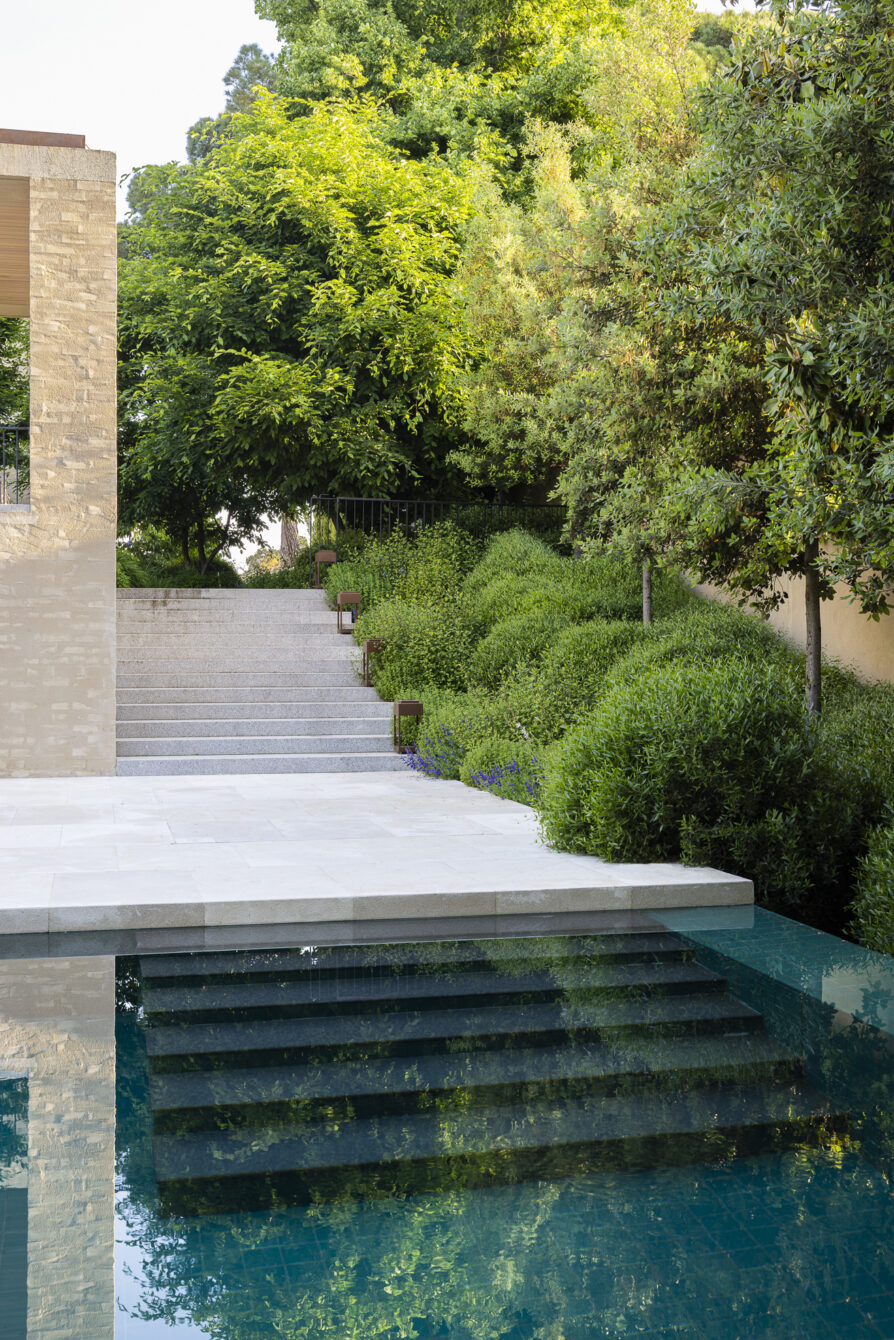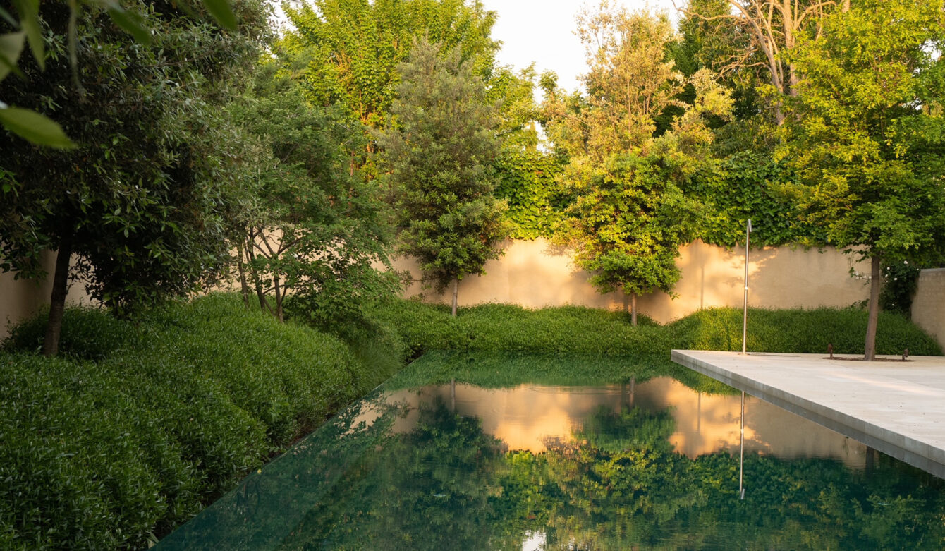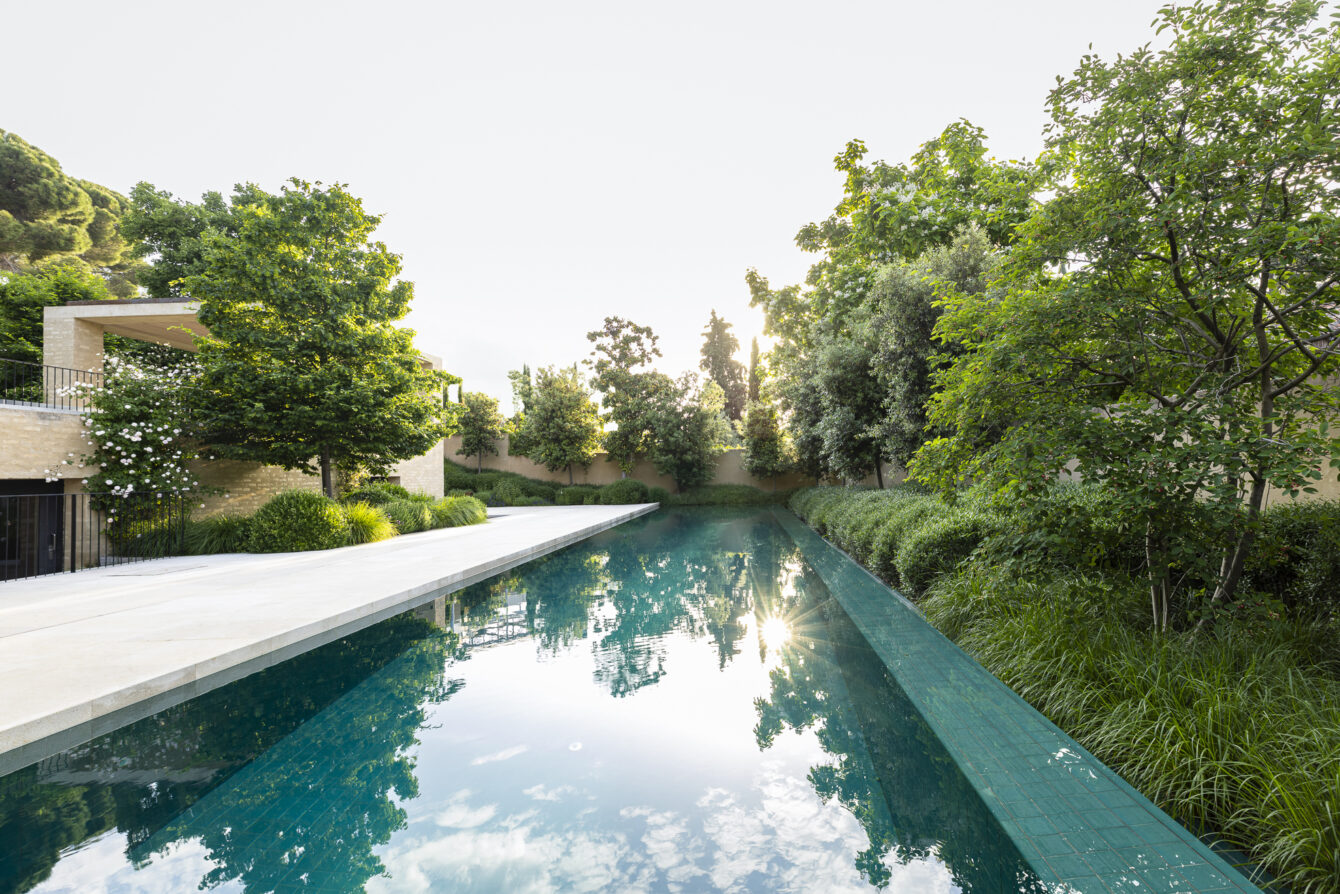 The swimming pool, conceived as a central landscape feature, is framed by clipped shrubs that suggest the idea of a pond and ensure year-round visual interest.