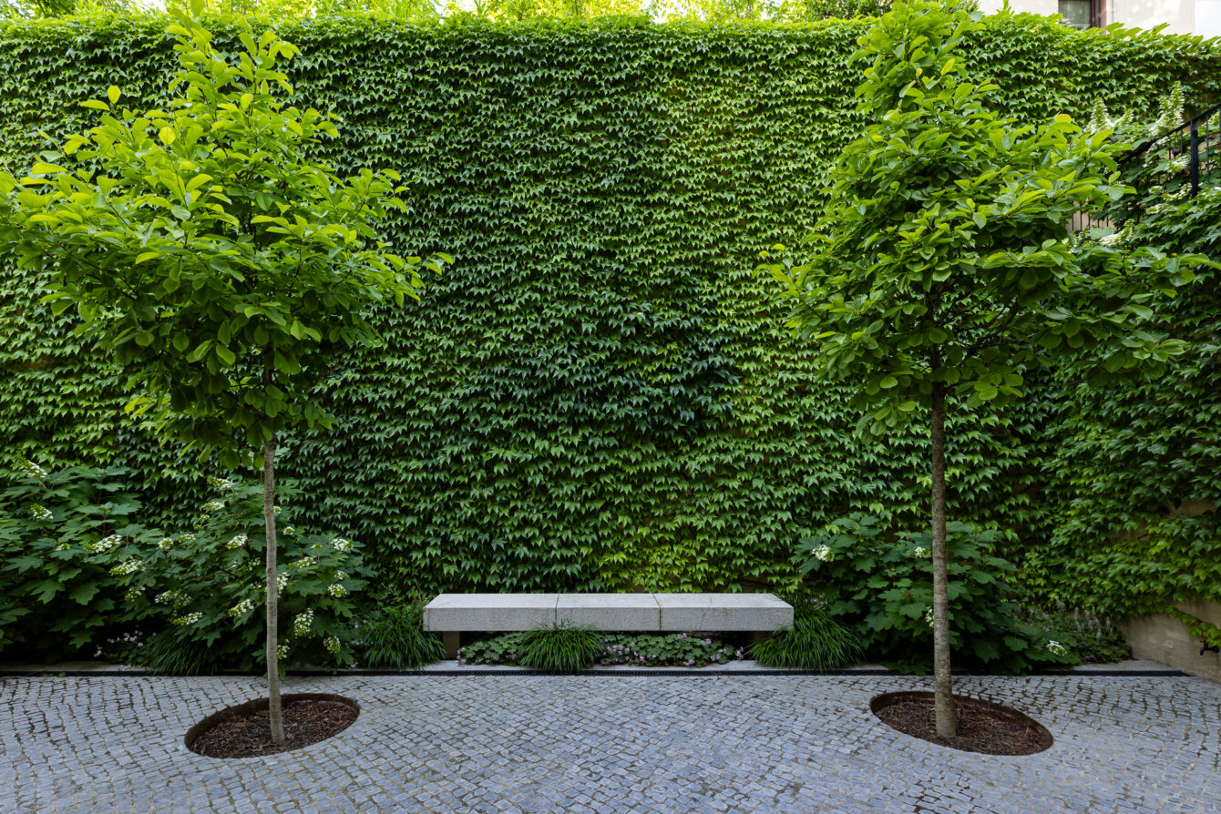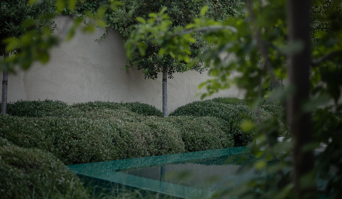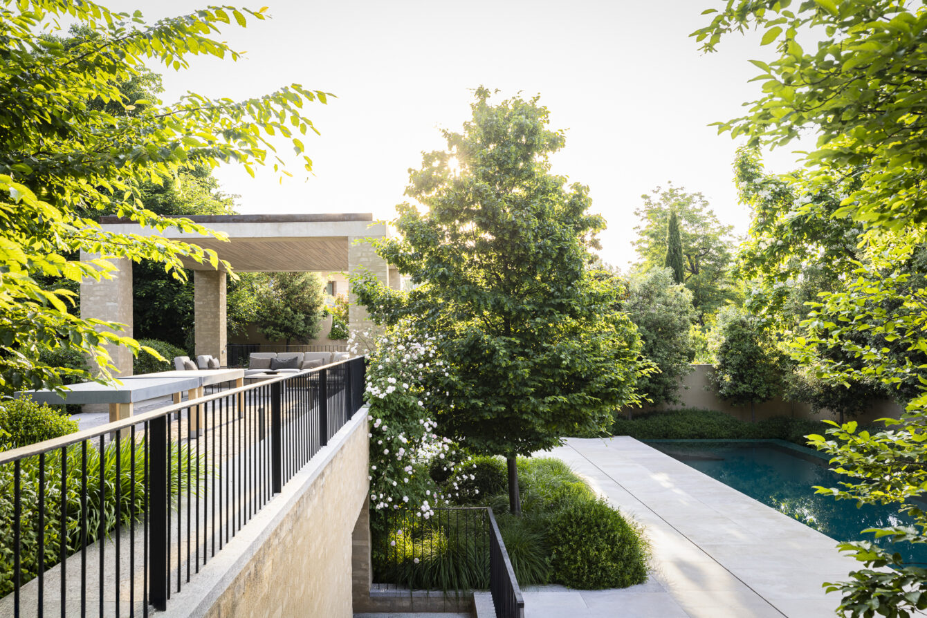 The swimming pool, conceived as a central landscape feature, is framed by clipped shrubs that suggest the idea of a pond and ensure year-round visual interest.