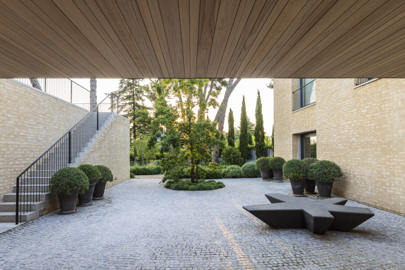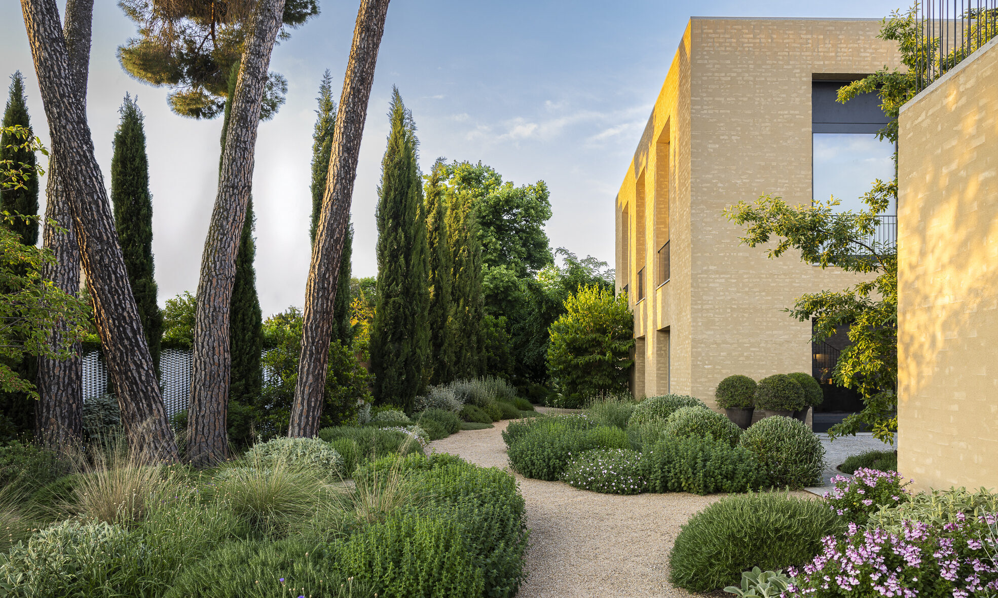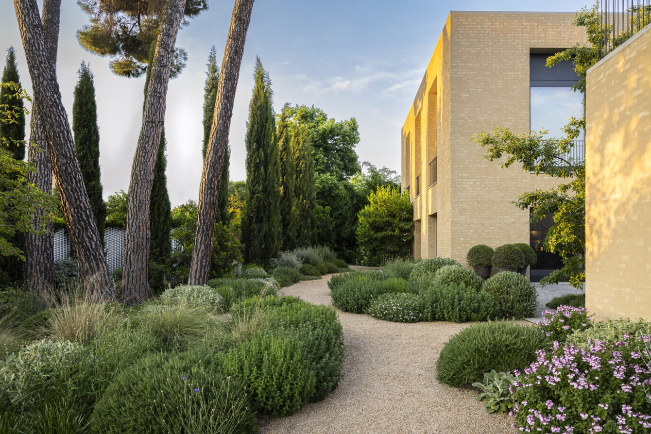 In this garden in Madrid, a gravel garden extends the tone and character of the house, unfolding among a group of existing stone pines that shape the space and provide shade. The Mediterranean planting gradually transitions into a cooler composition surrounding the lawn at the front of the house, creating a subtle dialogue between dry and lush areas.