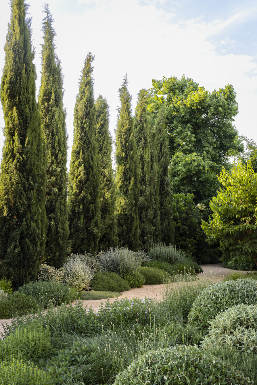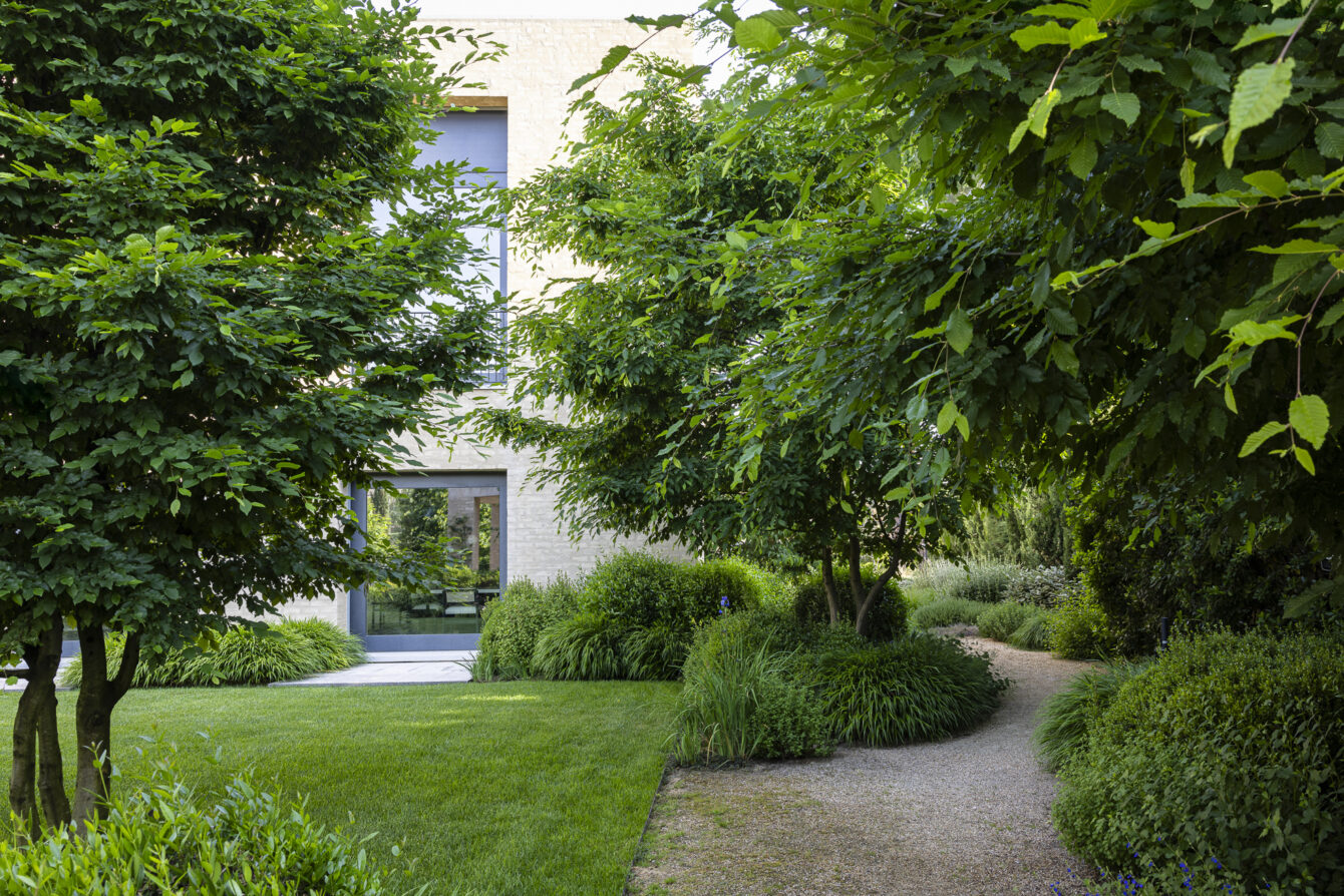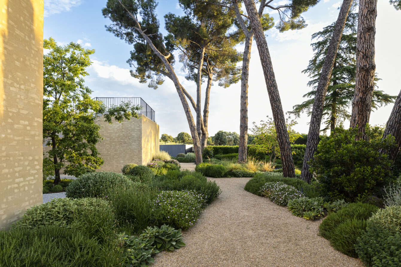 In this garden in Madrid, a gravel garden extends the tone and character of the house, unfolding among a group of existing stone pines that shape the space and provide shade. The Mediterranean planting gradually transitions into a cooler composition surrounding the lawn at the front of the house, creating a subtle dialogue between dry and lush areas.