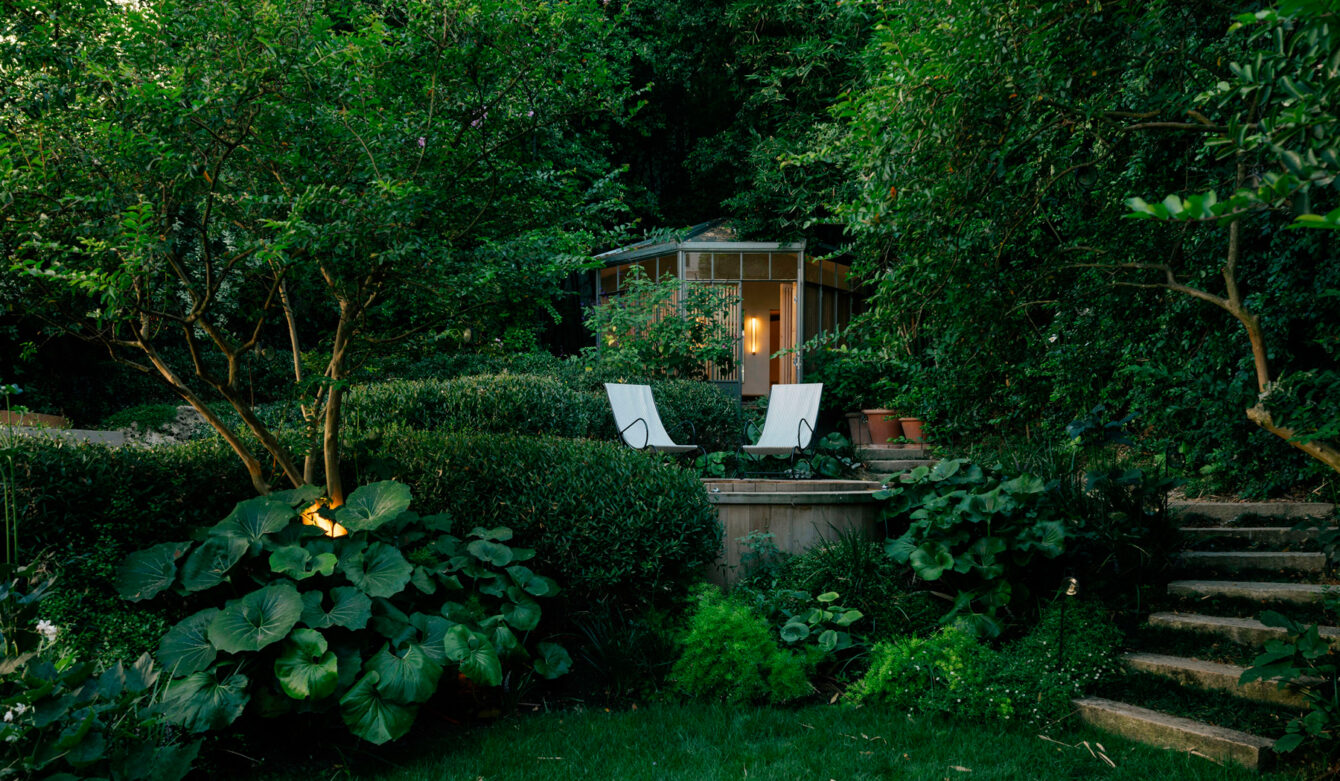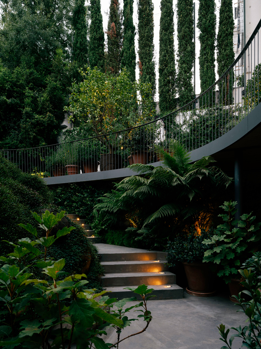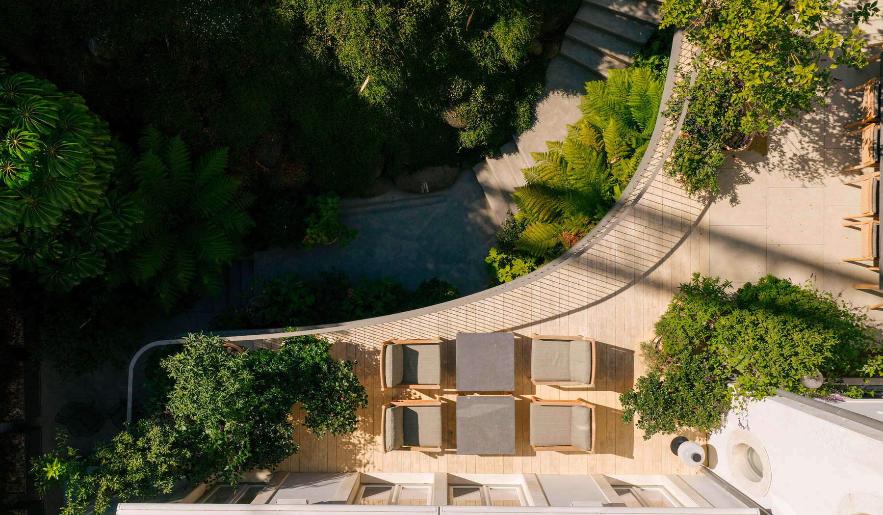 The design was highly complex due to the need to preserve and integrate several existing elements. A curved platform was created to provide direct access to the garden from the living room. At the far end, a small gazebo serves as a focal point and functions as a pool house. A hot tub was added, and the paving and pool materials were updated to refresh the overall space.