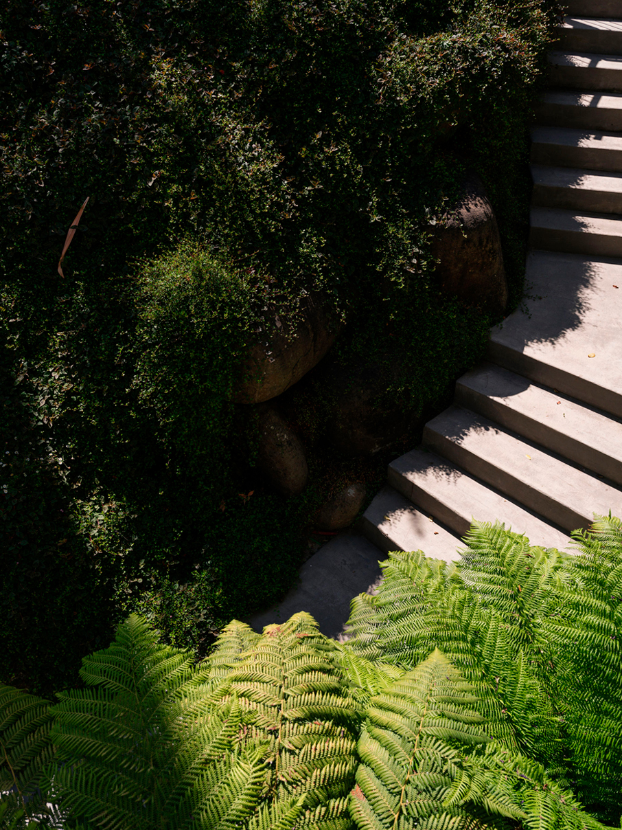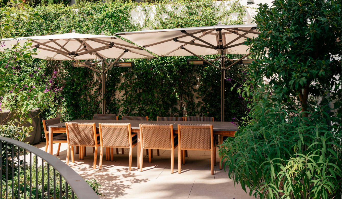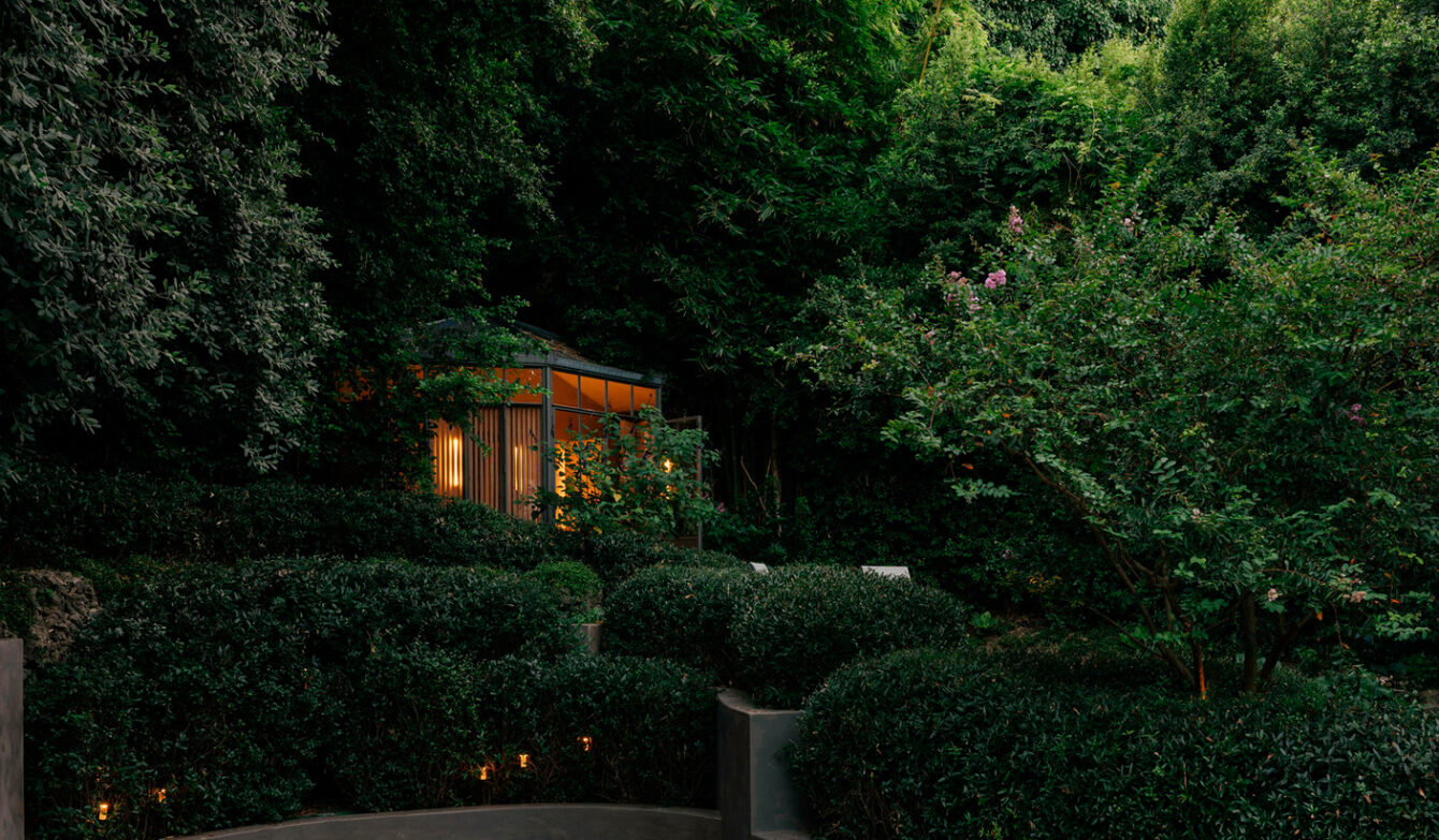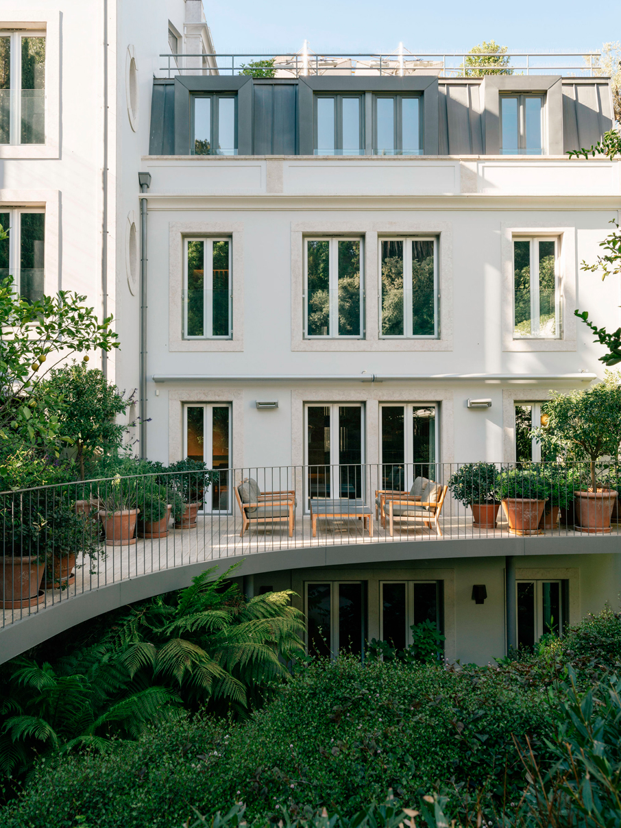 The design was highly complex due to the need to preserve and integrate several existing elements. A curved platform was created to provide direct access to the garden from the living room. At the far end, a small gazebo serves as a focal point and functions as a pool house. A hot tub was added, and the paving and pool materials were updated to refresh the overall space.