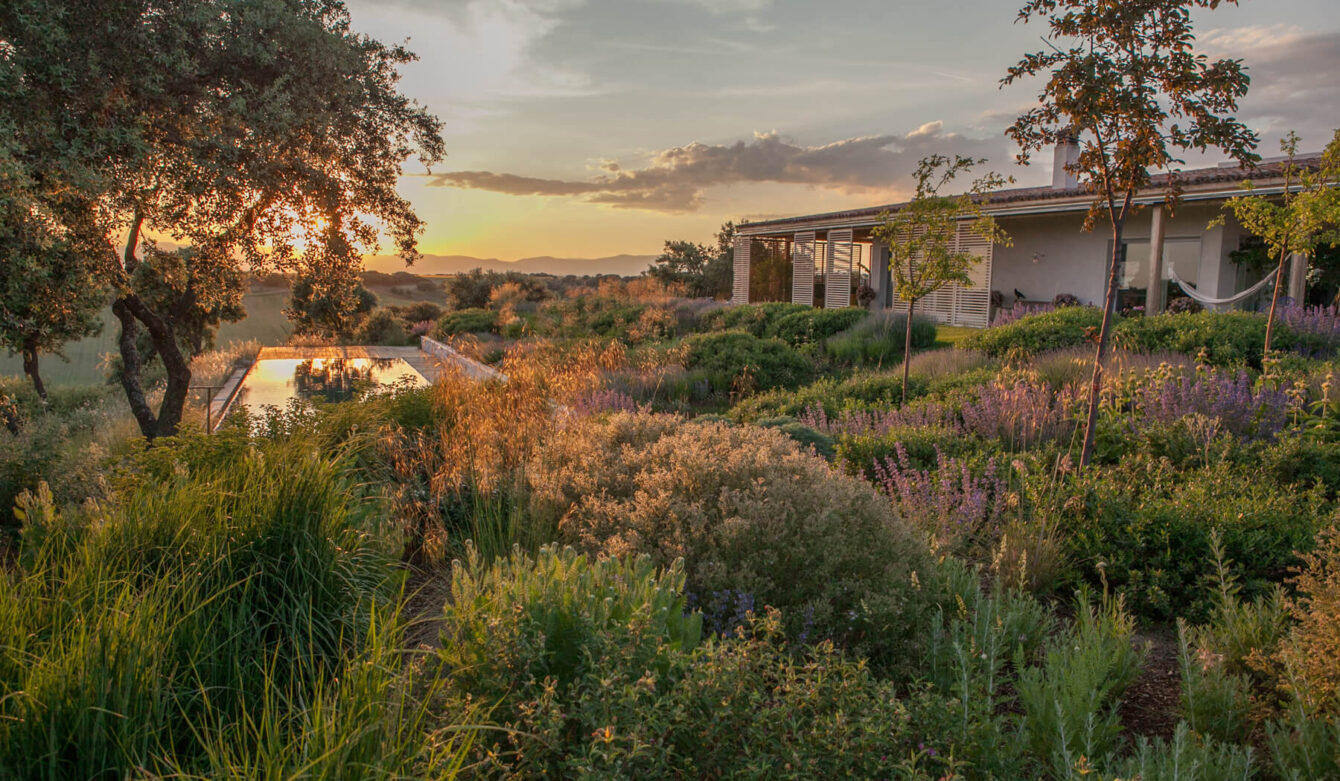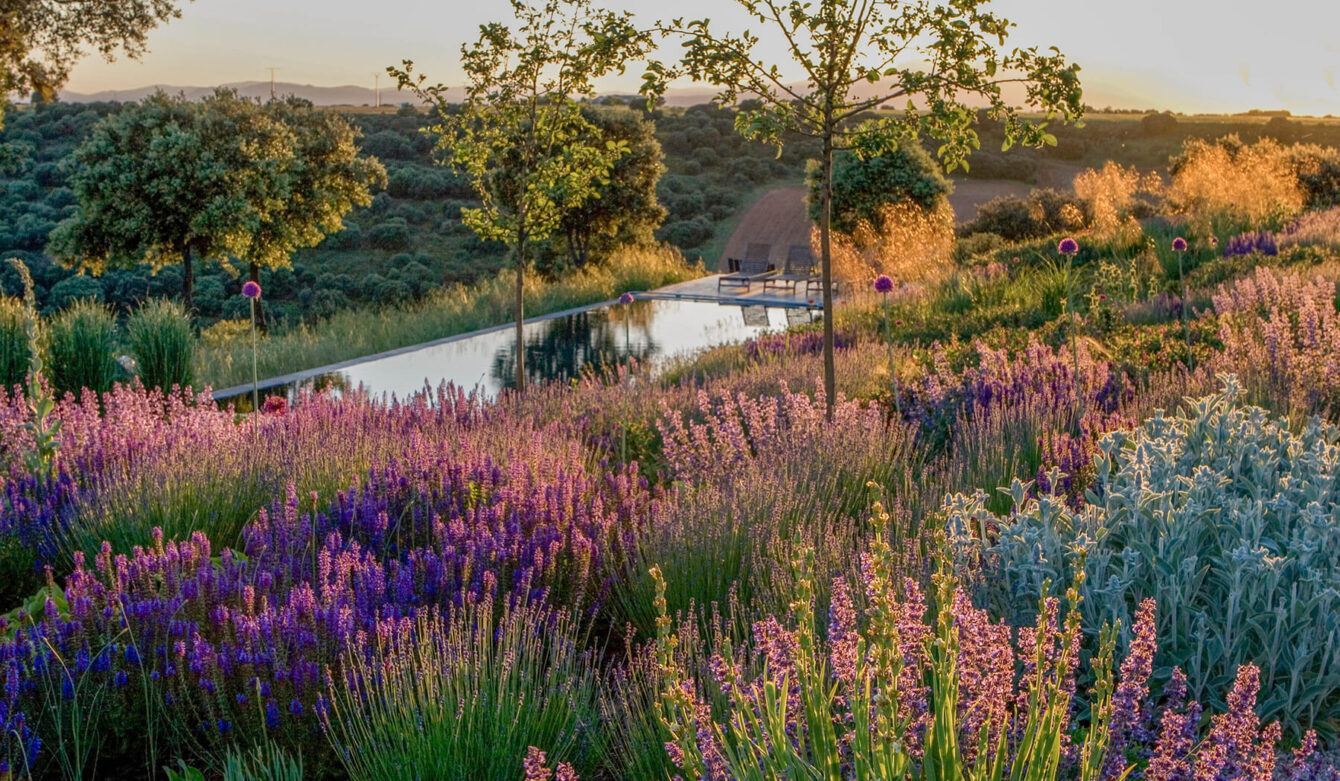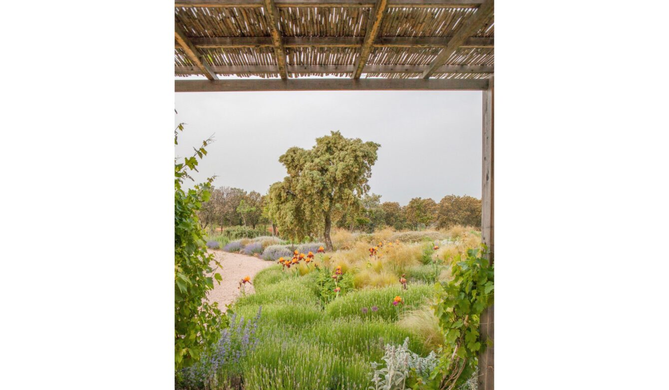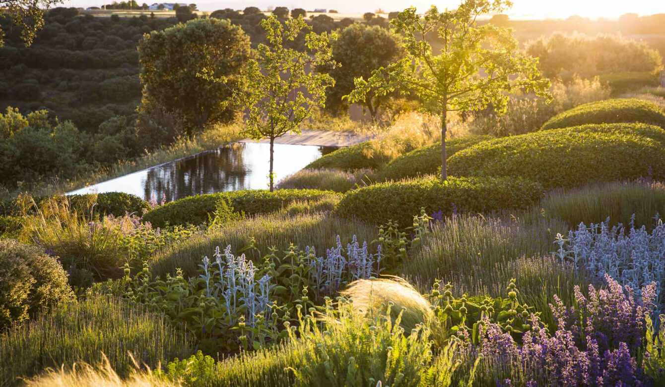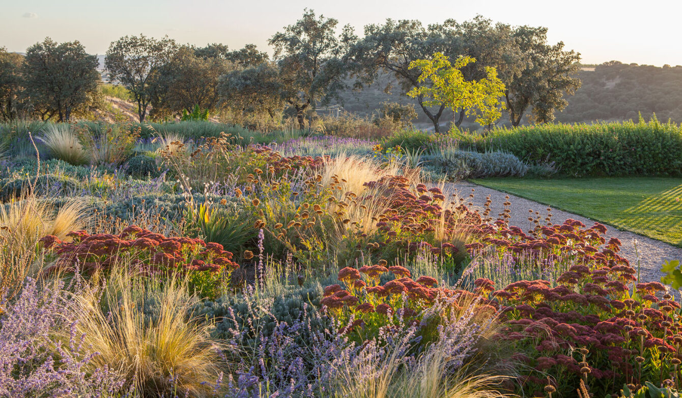 Una zona muy dura, marcada por veranos de 40º, mucho viento y poca agua, y un terreno con un fuerte desnivel, dotado de un suelo pedregoso y arcilloso, con solo una capa fina de tierra buena. Los condicionantes de este jardín, situado en el límite entre Madrid y Guadalajara, no podían ser más desafiantes. Sin embargo, sorprende su exuberancia y color. Los setos almohadillados y las matas de jaras muy recortadas proporcionan la estructura que enmarca una sucesión de floraciones que arrancan en la primavera y no cesan hasta el otoño: ríos de salvias, Allium, aromáticas, vivaces de hojas grises, lirios, sédums… Incluso secas, muchas de estas plantas resultan atractivas en invierno. Además, son resistentes a los conejos, condición indispensable en la región. A ellas se suman hierbas ornamentales que se mueven como olas impulsadas por el viento del sur y captan bellamente la luz del atardecer.