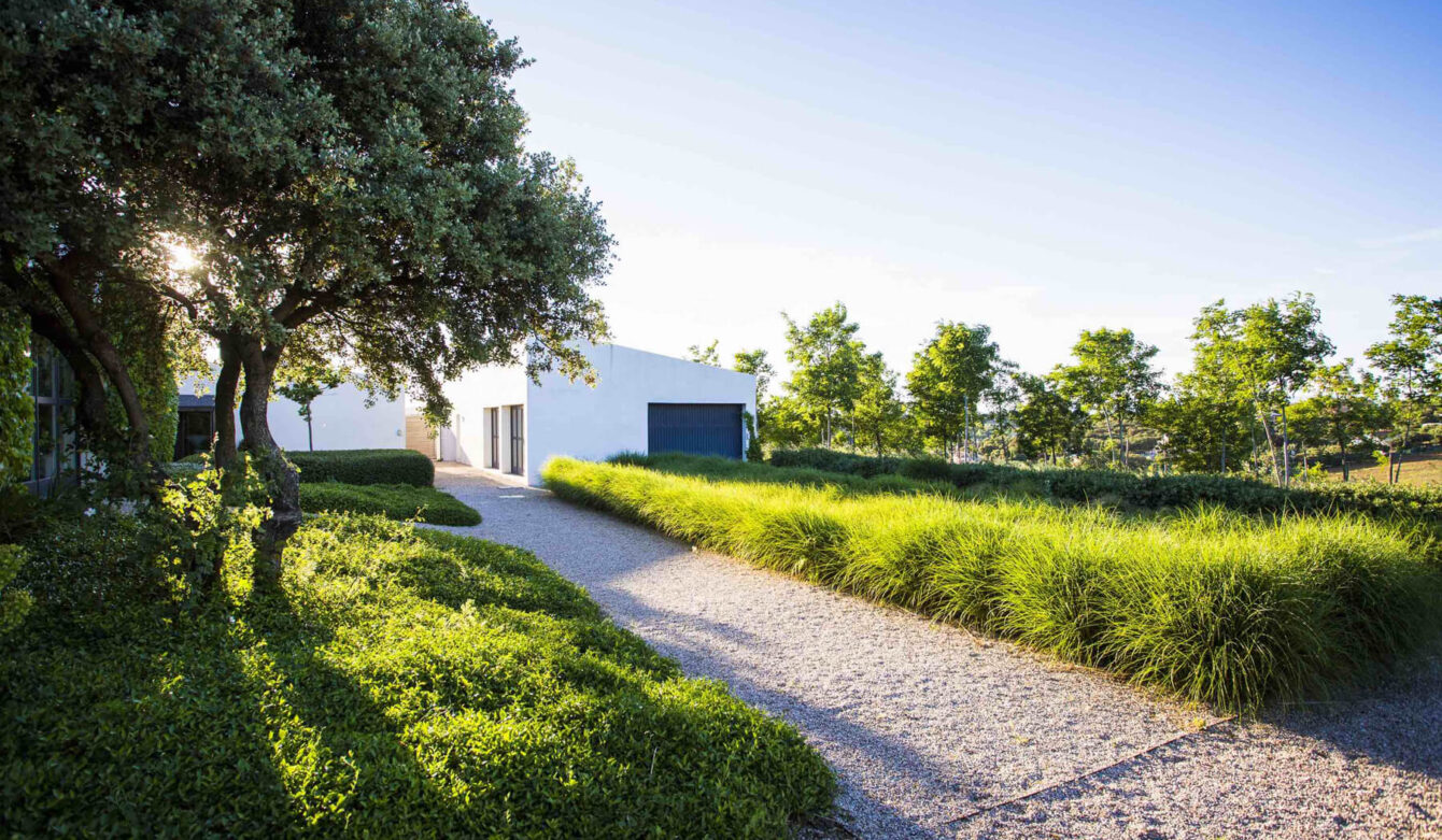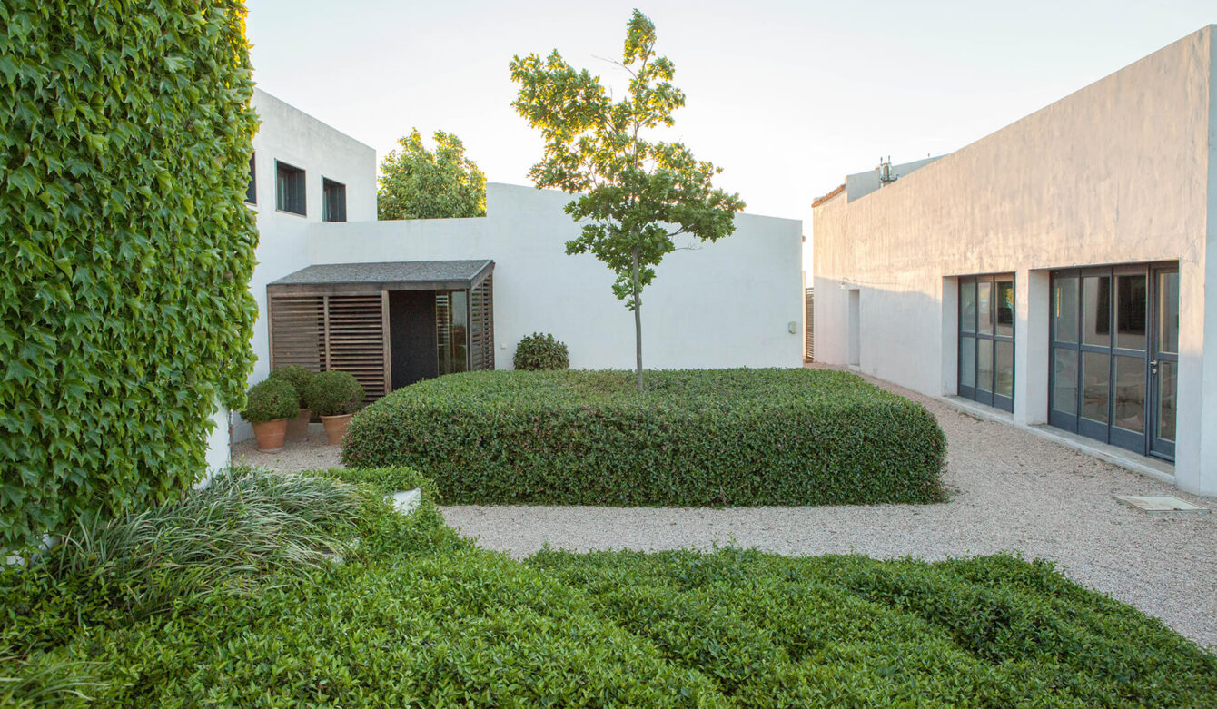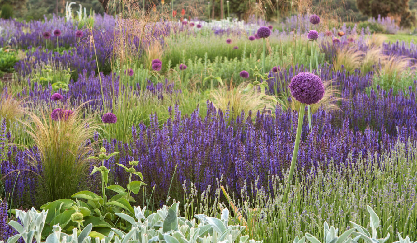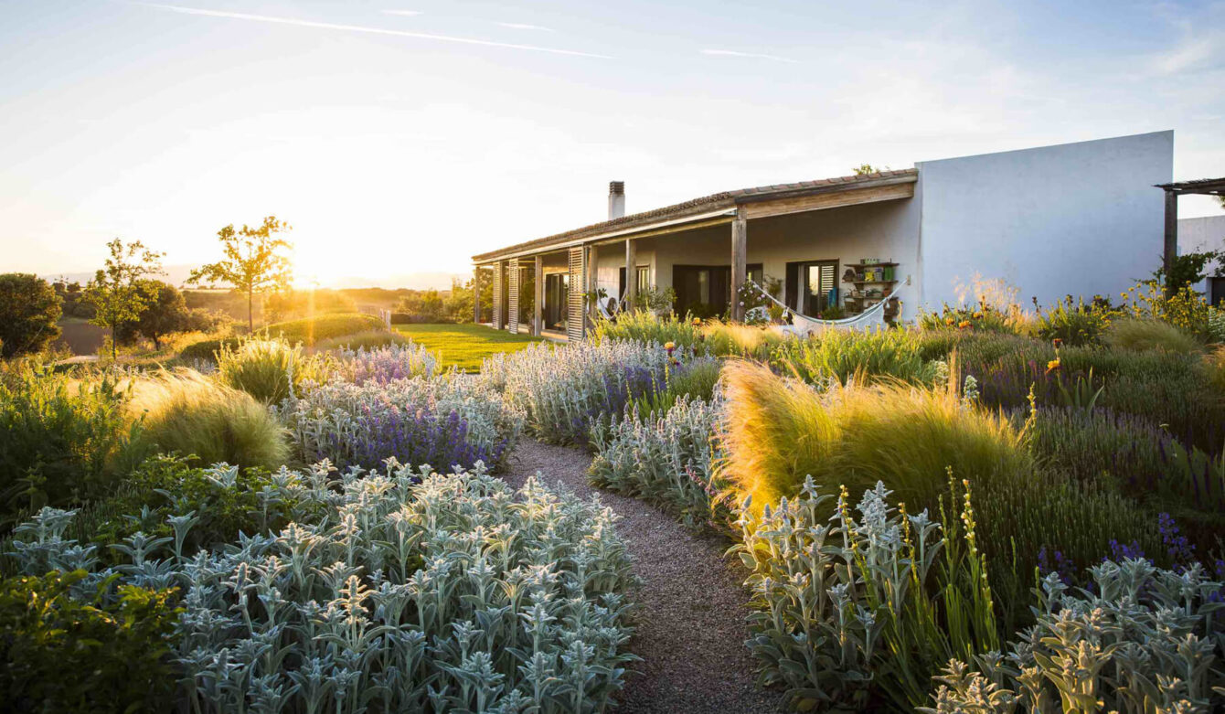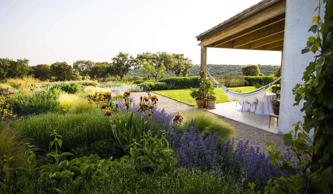 Una zona muy dura, marcada por veranos de 40º, mucho viento y poca agua, y un terreno con un fuerte desnivel, dotado de un suelo pedregoso y arcilloso, con solo una capa fina de tierra buena. Los condicionantes de este jardín, situado en el límite entre Madrid y Guadalajara, no podían ser más desafiantes. Sin embargo, sorprende su exuberancia y color. Los setos almohadillados y las matas de jaras muy recortadas proporcionan la estructura que enmarca una sucesión de floraciones que arrancan en la primavera y no cesan hasta el otoño: ríos de salvias, Allium, aromáticas, vivaces de hojas grises, lirios, sédums… Incluso secas, muchas de estas plantas resultan atractivas en invierno. Además, son resistentes a los conejos, condición indispensable en la región. A ellas se suman hierbas ornamentales que se mueven como olas impulsadas por el viento del sur y captan bellamente la luz del atardecer.