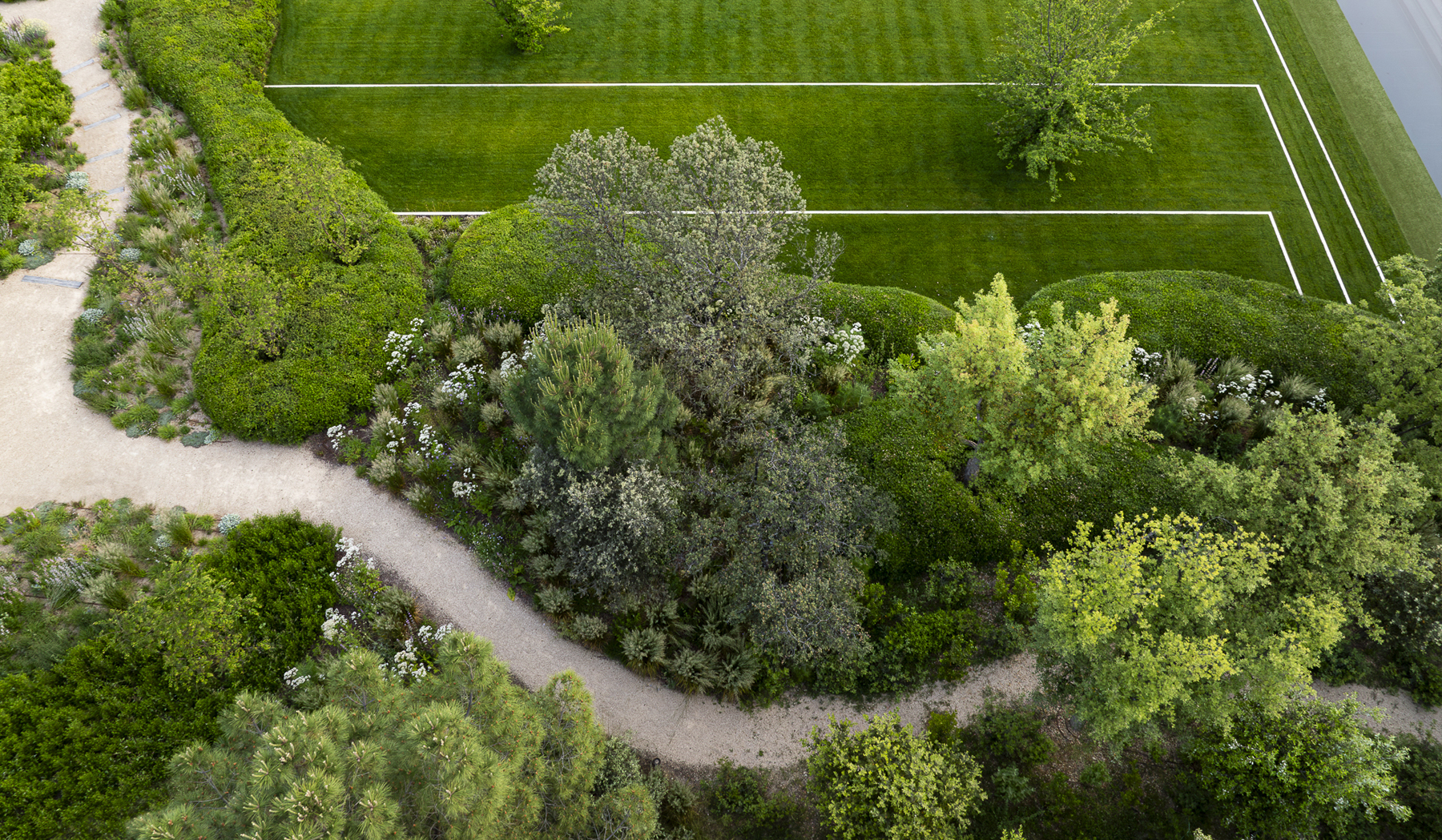 Frente a la vivienda, una masa baja de cotoneaster crea la transición con el césped. Este, al encontrarse en pendiente, se ha resuelto en terrazas escalonadas. Las líneas se subrayan con franjas blancas que remarcan los cambios de nivel y aportan dinamismo visual, convirtiendo la superficie en un elemento más del diseño.